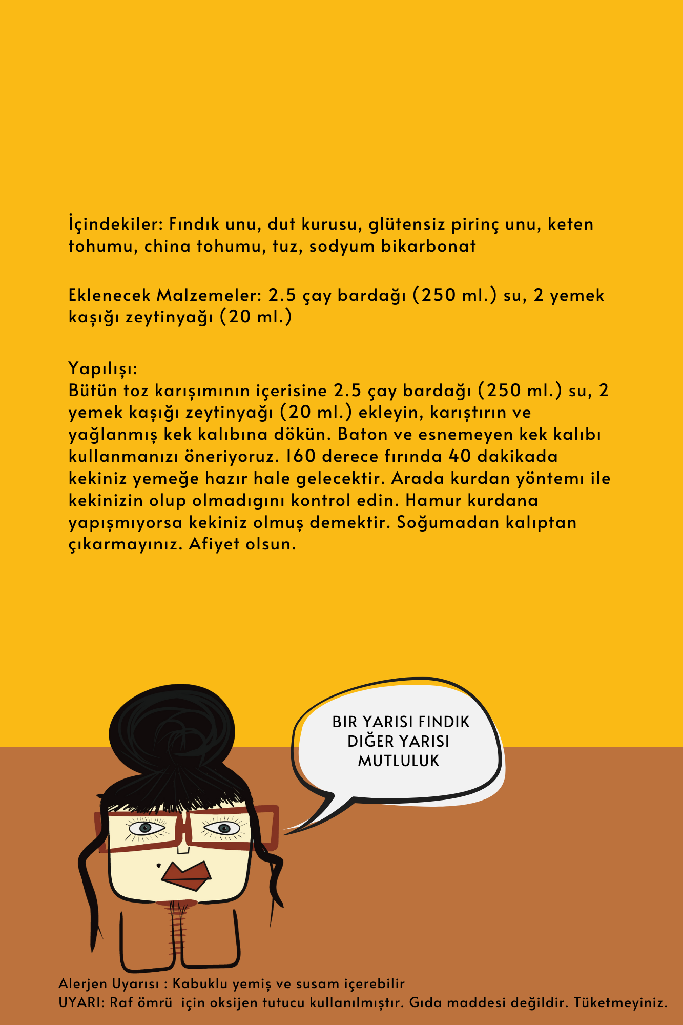 İçindekiler: Fındık unu, dut kurusu, glütensiz pirinç unu, keten tohumu, chia tohumu, tuz, sodyum bikarbonat
