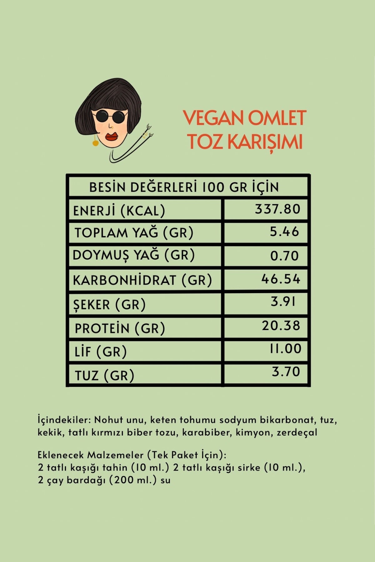 İçindekiler: Nohut unu, sodyum bikarbonat, tuz, kekik, tatlı kırmızı biber tozu, karabiber, kimyon, zerdeçal